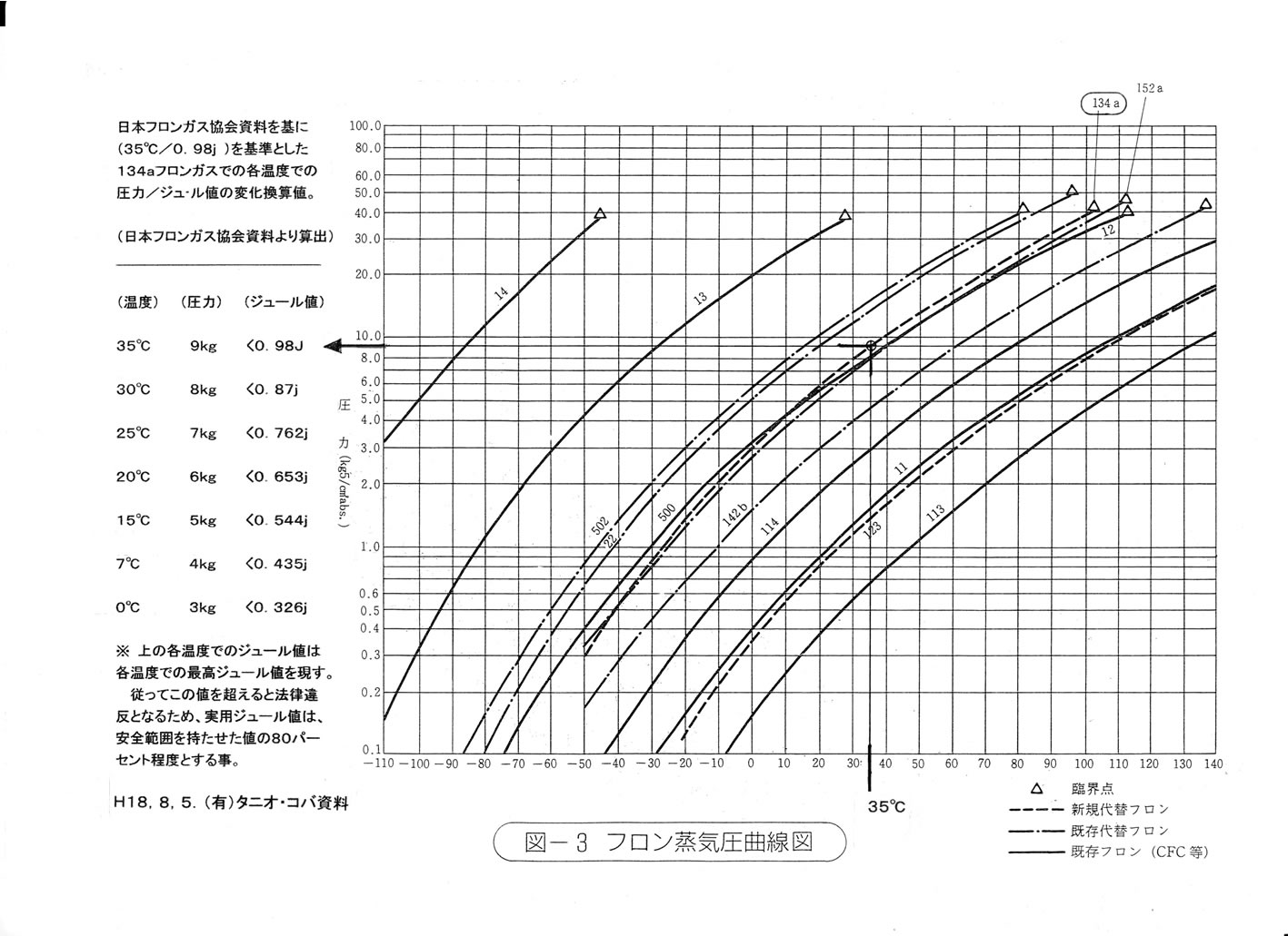 | 業界の中には「パワー測定は25度でも35度でも良いんだ!」。と云う人がいますが、別表の[フロンガス協会発行による:フロン蒸気圧曲線図]では、その圧力は35度では25度の時の≒1.27倍となり、パワーも比例して上がる事になります。つまり、25℃で測定した[0.762J/6mmBB]以上のガスガンは、[35℃では0.989Jを超える]“銃刀法律違反の準空気銃!”となるのです。 | ※したがって35℃以外の温度でのガスガンのパワー測定では、必ず別表の[フロン蒸気圧曲線図]による“パワー換算”を励行してください。これは貴方のお店とお客様を守るためですから。 資料作成: H19、1 (有)タニオ・コバ |