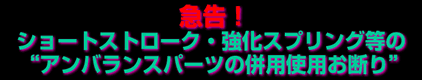 このためタニオ・コバ、当社製は、メーカー設定のブローバックバランスを基本としての安全強度を求め、このデータを基にへヴィーウエイトスライドやUSP・TACTICAL等を設計製作し、ブローバックのトータルバランスを無視したアンバランスパーツに対しては、到底対応できません。 以上の理由から、これ等のタニオコバ製品を安全に楽しく使用していただくために、カスタムショップ及びユーザーサイドでの“タニオコバ製へヴィーウエイトスライドとタニオコバUSP”へのショーストロークパーツ及び強化スプリングとの併用使用を禁止するとともに、この(上記パーツ及び同種機能阻害パーツ類との併用使用により発生した破損故障に限り)、一切の保障・修理の対象から外させていただく事を、本書面を以って告知いたします。